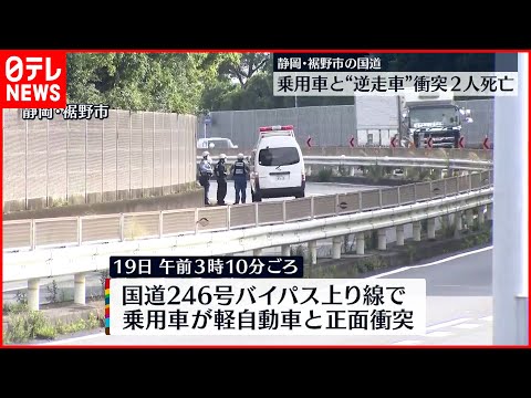 19日未明、静岡県裾野市で、乗用車が、軽自動車と正面衝突し、2人が死亡、4人が重軽傷を負いました。軽自動車が逆走していたとみられています。