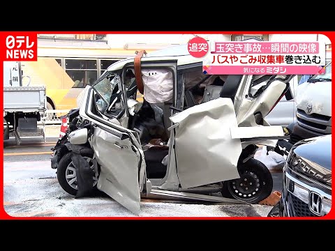 26日朝、大阪市の交差点の防犯カメラが“玉突き事故”の瞬間を捉えました。乗用車が軽自動車に突っ込み、そのまま信号待ちをしていたバスに衝突。さらに先頭で信号待ちをしていたごみ収集車も巻き込む多重事故になりました。
