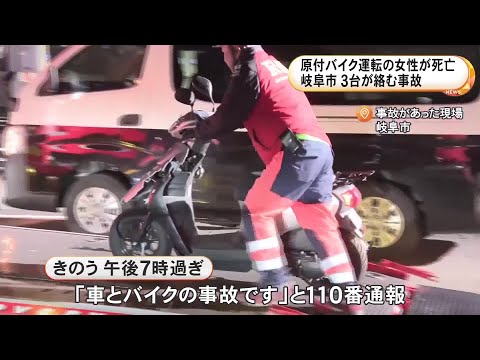 岐阜市の国道で19日夜、原付バイクや軽自動車など3台が絡む事故があり、原付を運転していた女性が死亡しました。